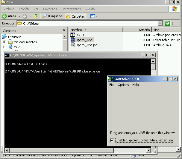 Copiamos el archivo JAR que queramos firmar, ponemos una copia en el directorio C:\MS\New y hacemos doble click en DO-IT! La aplicacion nos abrira el JADMaker, arrastramos el archivo Jar para que la aplicacion nos cree el correspondiente JAD. Al cerrar el JADMaker, el archivo bat continua la labor lanzando un CMD que nos firmara el JAD. Con esto habremos conseguido nuestro objetivo de forma rapida y comoda. Es posible que encontremos alguna dificultad, en cuyo caso, saltar al paso 4.